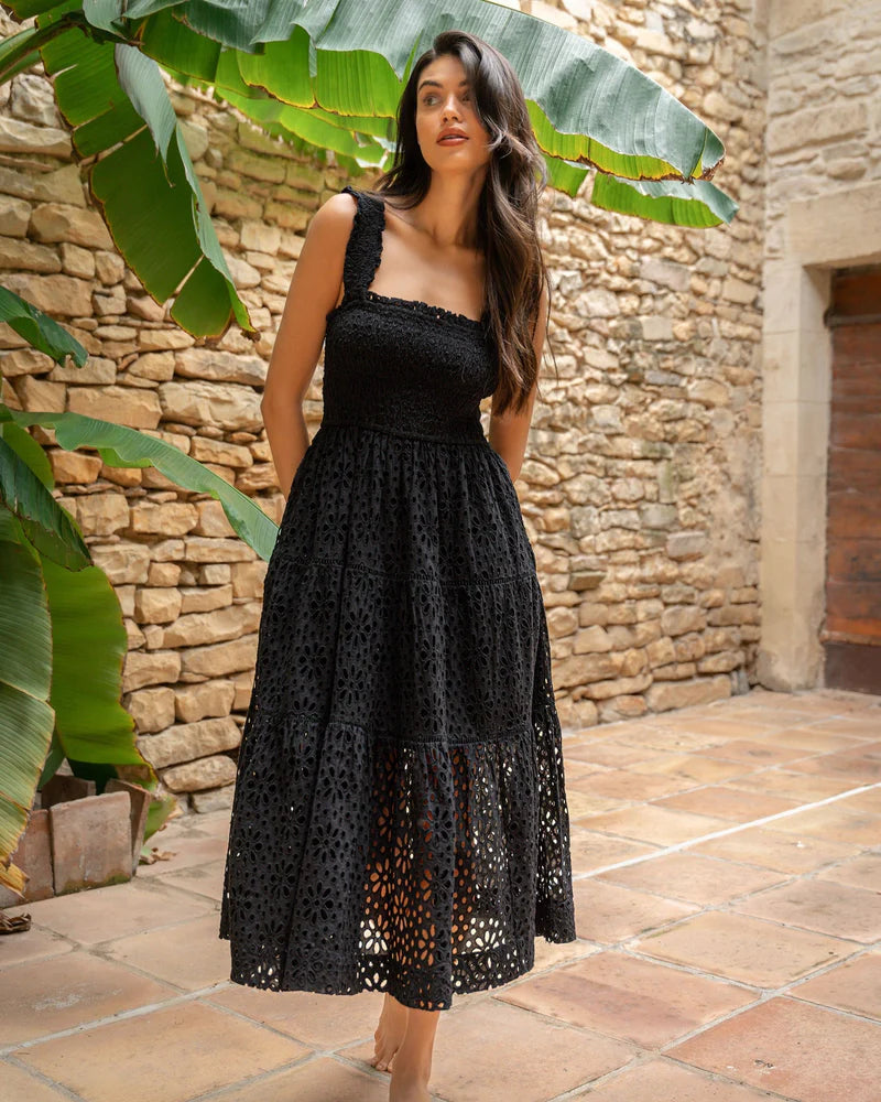 With a flattering smocked bodice, adjustable straps, and a playful tiered skirt, this dress combines comfort and style in one easy piece. Pair it with sandals or sneakers for a look that is laid-back yet ready for anything the day or night brings.