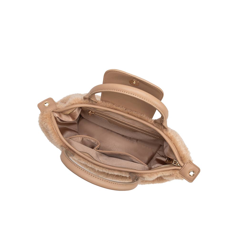 Expertly designed, the Winnie tote features a crossbody strap for versatile wear while the sherpa material adds a touch of comfort and style. With a top handle for easy carrying, this functional tote offers both style and practicality. The spacious interior allows for ample storage. * Recycled Vegan Leather/Polyester * 14.5"W x 8"H x 5"D * Handle Drop: 3" * Strap Length: 39"-45" * Magnetic Snap Closure * Gold-Tone Hardware * Interior Zip & Slot Pockets *
