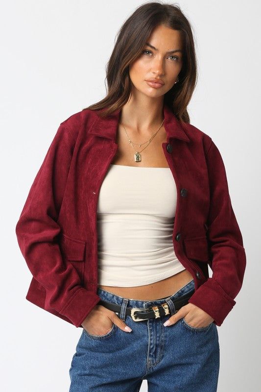 Our Salma Jacket features a soft faux suede fabric for a smooth, velvety feel and a relaxed fit with front pockets and a structured collar for a polish look.