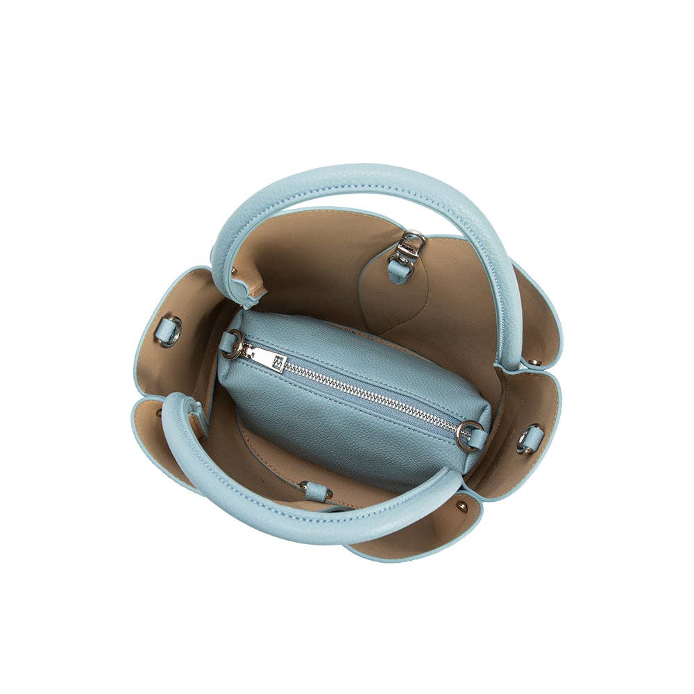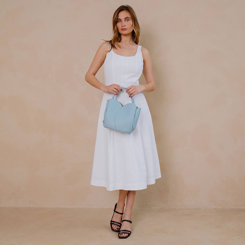 Our Tulip Bag, shaped like a delicate tulip, adds a touch of elegance to any outfit. Featuring a pebble leather texture, it can be used as a top handle or crossbody bag. The removable zip pouch inside also comes with a detachable strap for added functionality. * Recycled Vegan Leather * 13.5" W x 8.75"H x 4"D * Handle Drop: 5.5" * Strap Length: 36. 5"-42.5" * Snap Hook Closure * Silver-Tone Hardware * Removable Zip Pouch * Nested Feet *