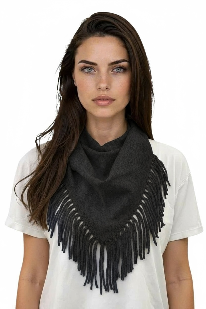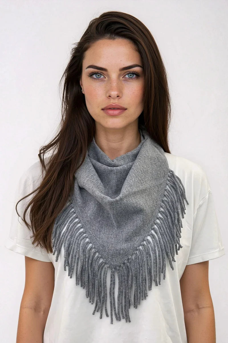 The 100% cashmere neckerchief adds instant polish — whether you knot it, drape it, or toss it effortlessly over your shoulder. The soft fringe gives it a cool, undone edge while the plush cashmere feels like a warm hug.