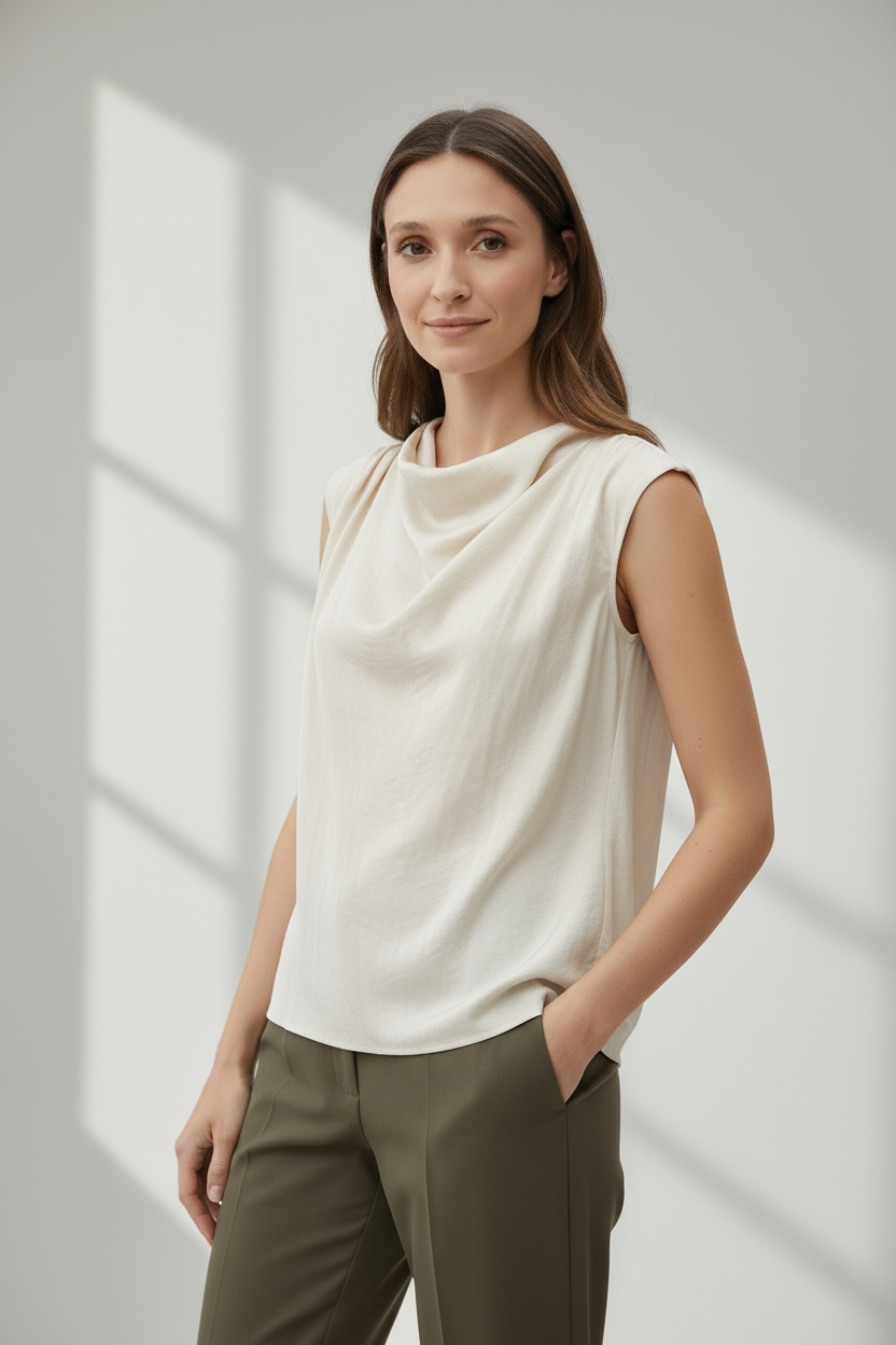 The Draped Sleeveless Top with Gathered Neckline offers a blend of elegance and effortless style. Featuring a draped design and a gathered neckline, this top creates a flattering and chic silhouette. Ideal for layering or wearing on its own, it adds a sophisticated touch to any outfit.