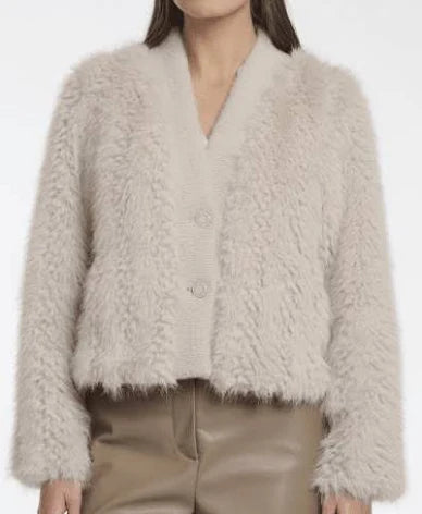 Indulge in ultimate cozy chic with the Chaimae cardigan. This stylish cardigan features a luxuriously fluffy, faux-fur body paired with a contrasting knitted middle front. Complete with side slit pockets for practicality and a classic button closure. Stay warm and on-trend all season long.