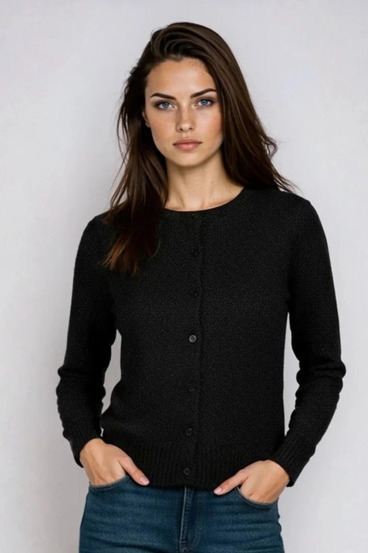 Elevate your everyday with a hint of shimmer. This ultra-soft cashmere crew neck cardigan drapes effortlessly, hugging your silhouette while subtle sparkle catches the light with every move. Perfect over jeans, skirts, or layered on chilly nights — it’s cozy luxury that makes every outfit feel a little more special.